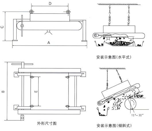 | 型號(hào)\參數(shù)\項(xiàng)目 | 適應(yīng)帶寬 mm | 額定吊高 h=mm | 物料厚度 ≤mm | 磁場(chǎng)強(qiáng)度 ≥mT | 適應(yīng)帶速 ≤m/s | 重量 kg | 外形尺寸 A×B×C | 懸掛尺寸 D×E |